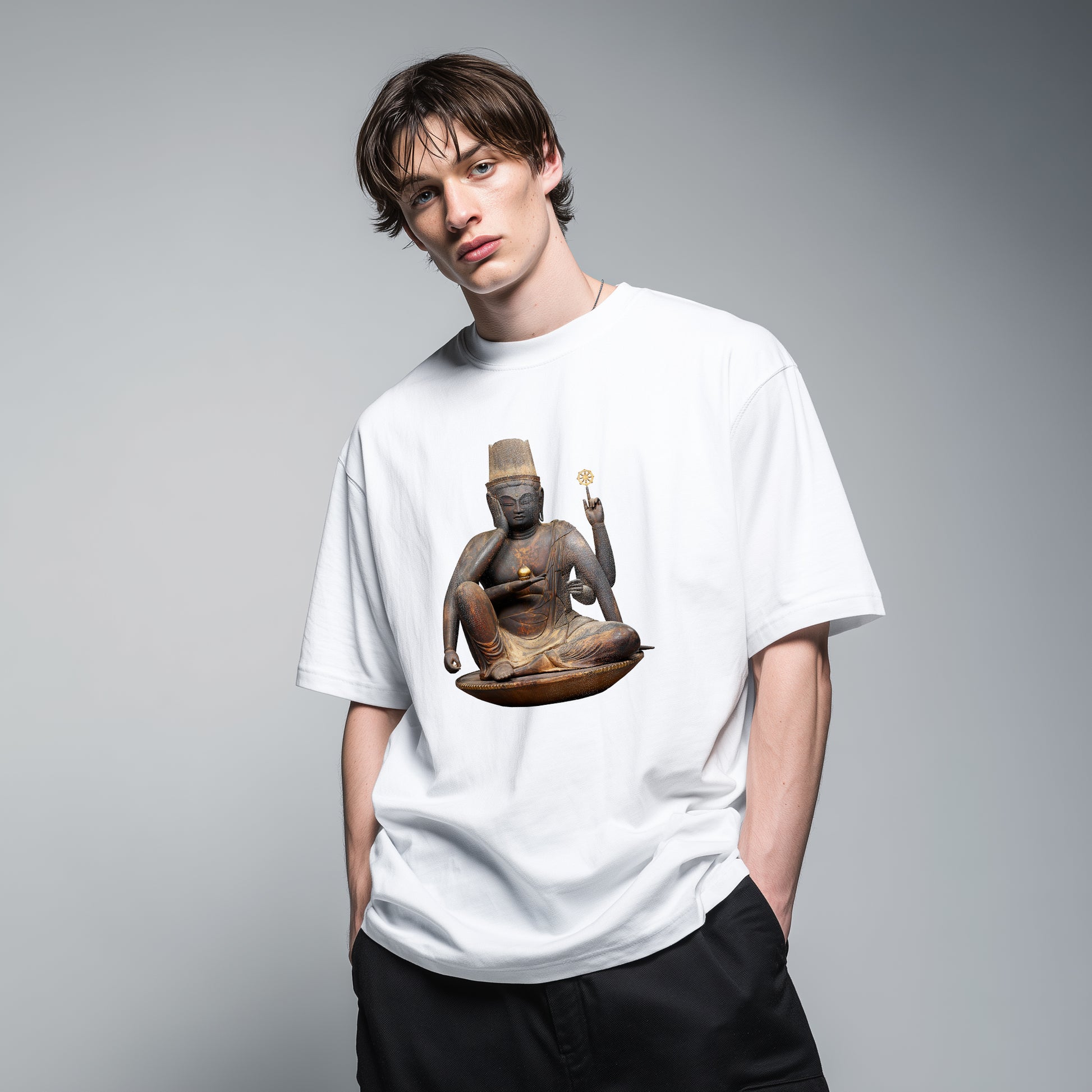 This Buddhist statue, created in the 9th–10th century, depicts Nyoirin Kannon, a six-armed form of the bodhisattva Kannon. It holds a wish-fulfilling jewel and a dharma wheel, symbolizing the suppression of earthly desires. According to legend, it was discovered in the early Edo period, having emerged from the sea.