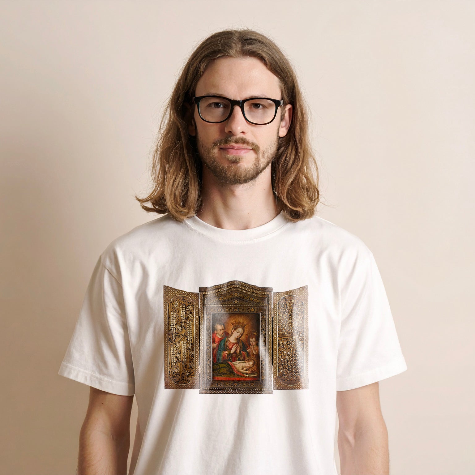 This 16th-century lacquerware piece, made for church rituals, belongs to the genre known as "Namban lacquerware," produced in Japan for export to Europe. Designed as a slender shrine, it uniquely blends Western aesthetics with traditional Japanese techniques, such as "maki-e" and mother-of-pearl inlay. At its center is a copperplate oil painting imported from Europe, depicting Mary, Christ, Joseph, and John.