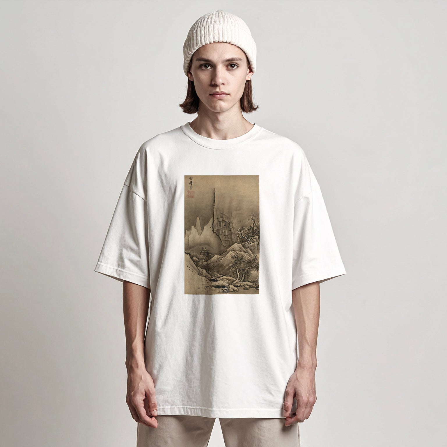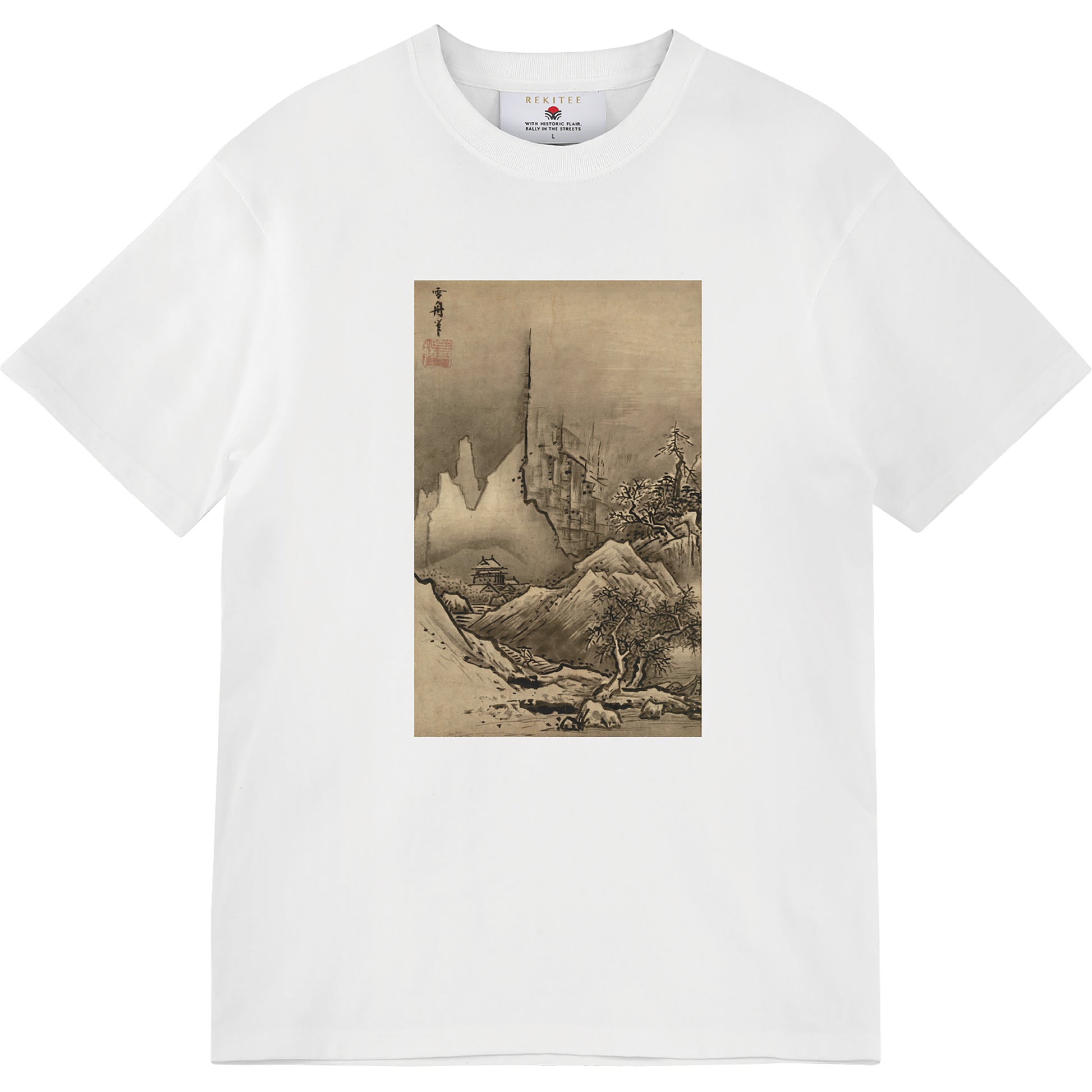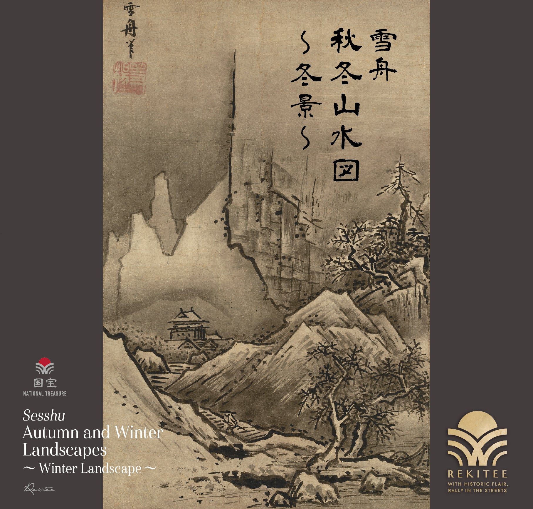 This work uses bold brushstrokes to express the severity of a winter mountain landscape. The strong central vertical line, common in landscape painting, highlights the cliff’s outline and draws the viewer’s eye. Sesshū's works include six designated National Treasures—the most of any Japanese painter—as well as 19 Important Cultural Properties.