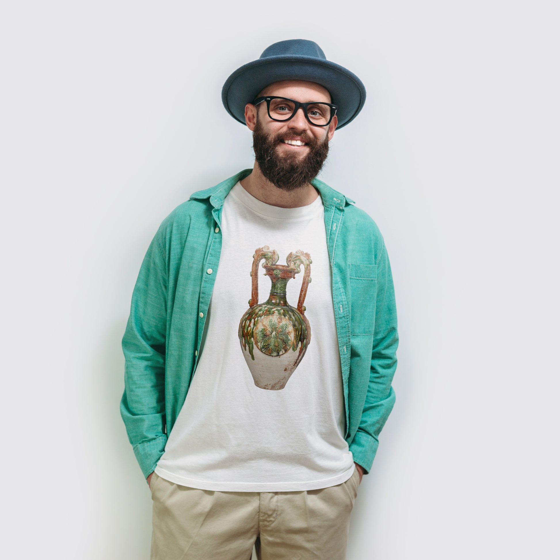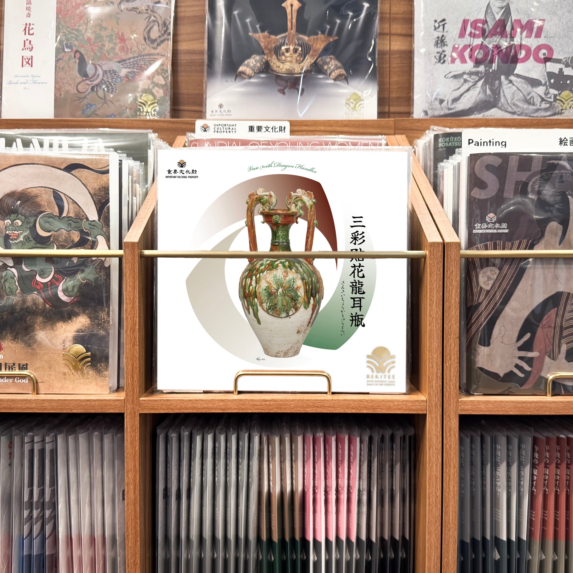 This 8th-century three-color glazed ("Sancai") vase was produced in China. "Sancai" refers to pottery glazed in three colors—typically white, green, and brown—and fired at low temperatures, with Tang Sancai being particularly renowned. The vase’s shape resembles that of an ancient Greek amphora, with dragon-shaped handles. Large molded circular decorations featuring floral patterns adorn three sides of the body, showcasing intricate craftsmanship.